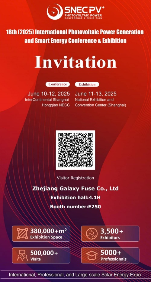 Klíčová slova:SNEC PV+, Photovoltaic Exhibition, New Energy Exhibition, Šanghajská solární výstava, výstavní náhled, informace o stánku,Zhejiang Galaxy Fuse Co. Ltd.,Pojistka, PV pojistka, Smart Energy, výstavní pozvání, výstava 2025, výstava Šanghaje.
